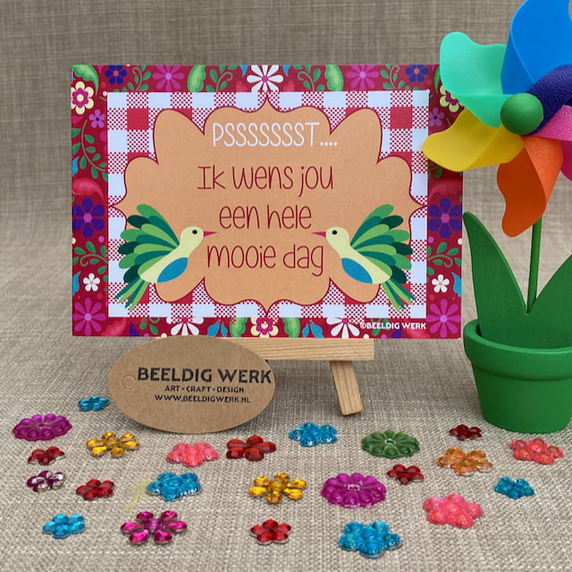 Wens iemand een mooie dag met deze rode kaart vol bloemen en vogeltjes van Beeldig Werk! Perfect voor een verjaardag, succes of zomaar. Een kleurrijke verrassing. Bestel nu!