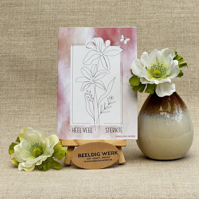 Wens iemand sterkte met deze ingetogen kaart van Beeldig Werk. Een fijne lijntekening van een bloem op een zachte achtergrond. Een liefdevol gebaar bij het verlies van een dierbare.