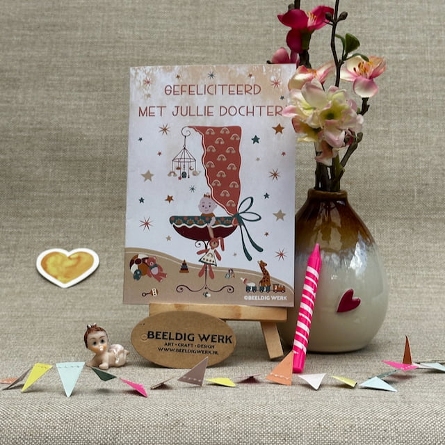 Hoera, een meisje! Feliciteer de kersverse ouders met deze vrolijke geboortekaart van Beeldig Werk. Een lief ontwerp vol sterretjes en een wiegje. De mooiste groet voor een dochter! Bestel nu.