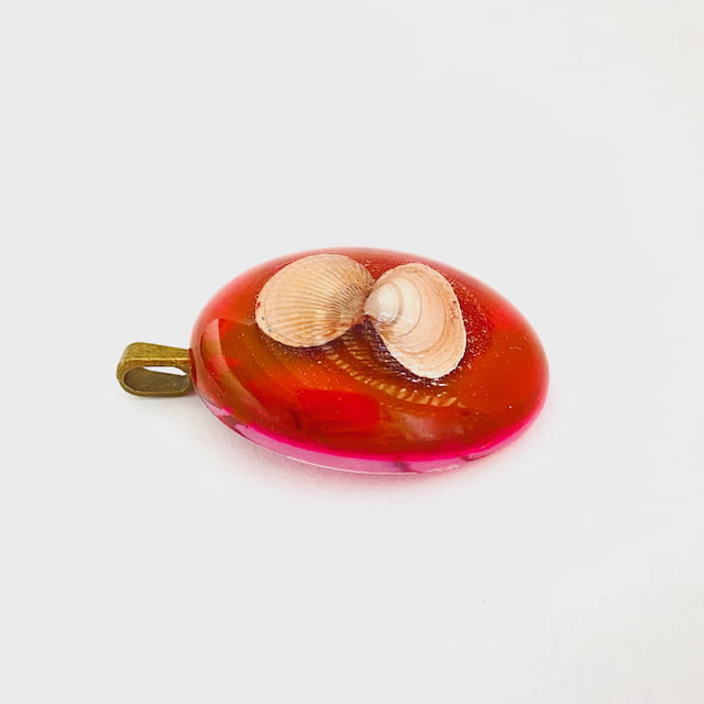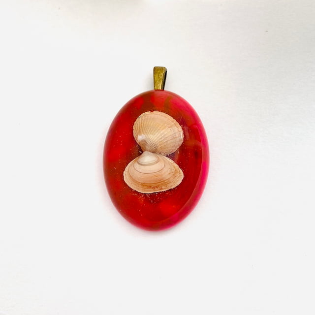 Ontdek deze opvallende ovale rode cabochon hanger van Beeldig Werk. Een ware eyecatcher! Dit handgemaakte sieraad is uniek ingelegd met twee delicate witte schelpjes.