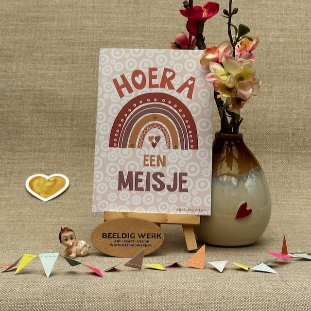 Hoera, een meisje!  Verras de kersverse ouders met een hippe geboortekaart van Beeldig Werk. Trendy designs met regenbogen en hartjes. Bestel direct online!