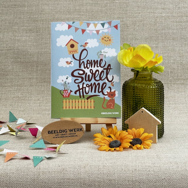 Gefeliciteerd met je nieuwe woning! Stuur deze vrolijke Home Sweet Home kaart van Beeldig Werk vol bloemen, vogeltjes en een poes. De perfecte verrassing voor een verhuizing. Bestel direct online!