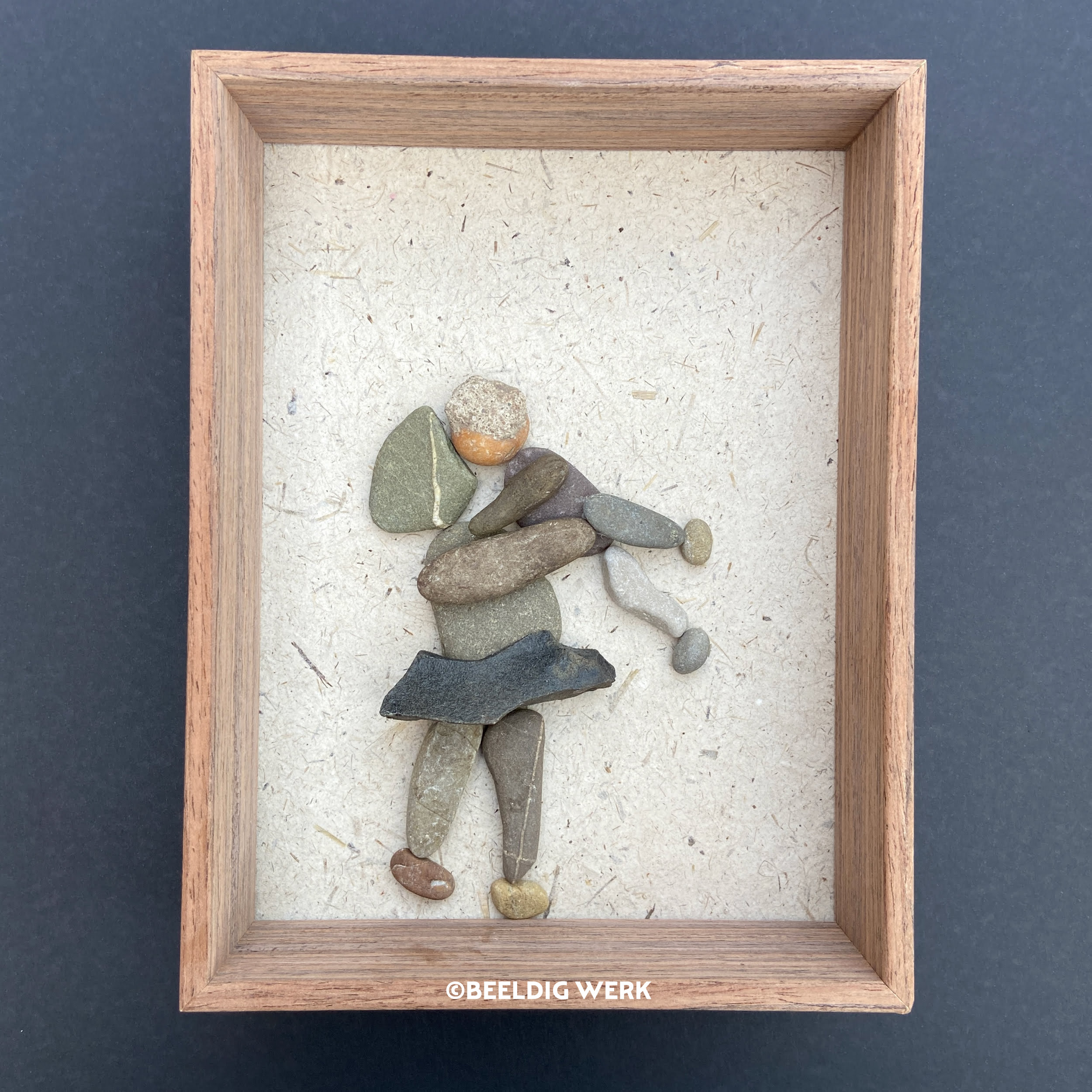 Ontdek unieke kiezelkunst “Knuffel” van Beeldig Werk. Dit 3D-werk (16x21x5 cm) is gemaakt van kiezelstenen op handgeschept papier van olifantenpoep. Inclusief houten lijst en ophanghaakje. Kijk nu!