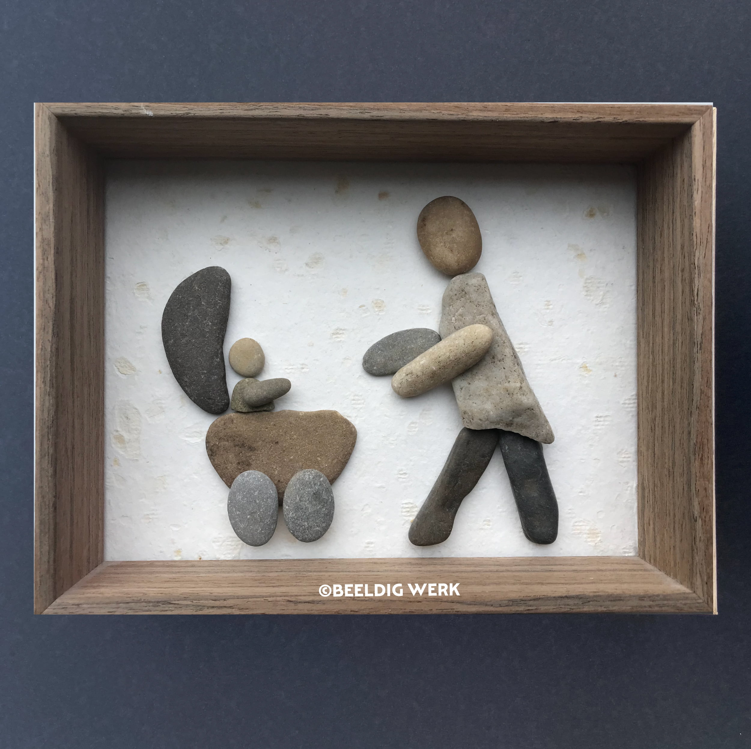 Ontdek unieke kiezelkunst “Moeder en kind” van Beeldig Werk. Dit 3D-werk (20x29x5 cm) is gemaakt van kiezelstenen op handgeschept papier van sinaasappelschillen. Inclusief houten lijst en ophanghaakje. Bestel nu!
