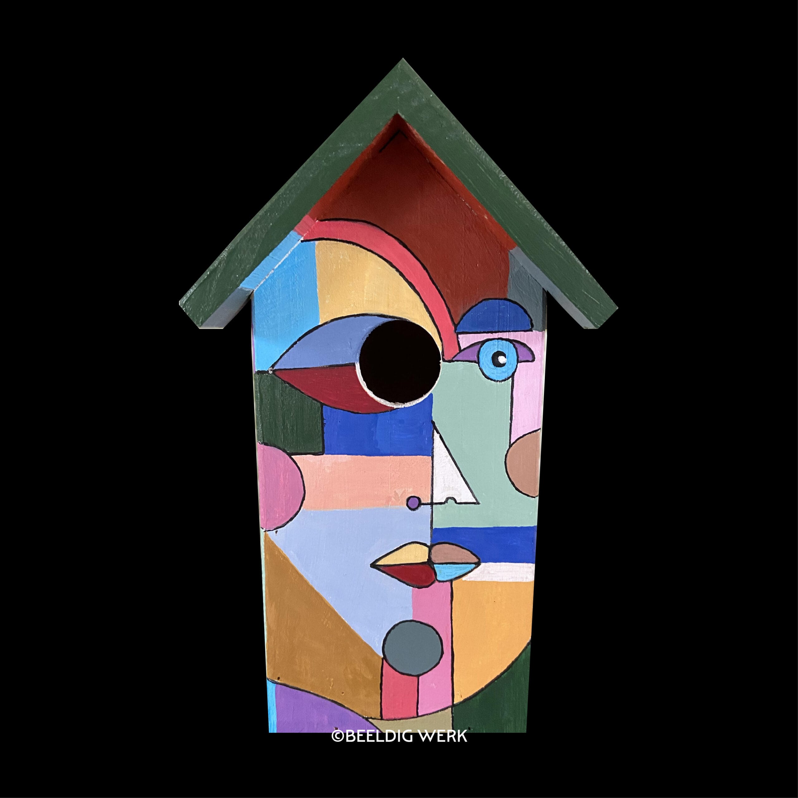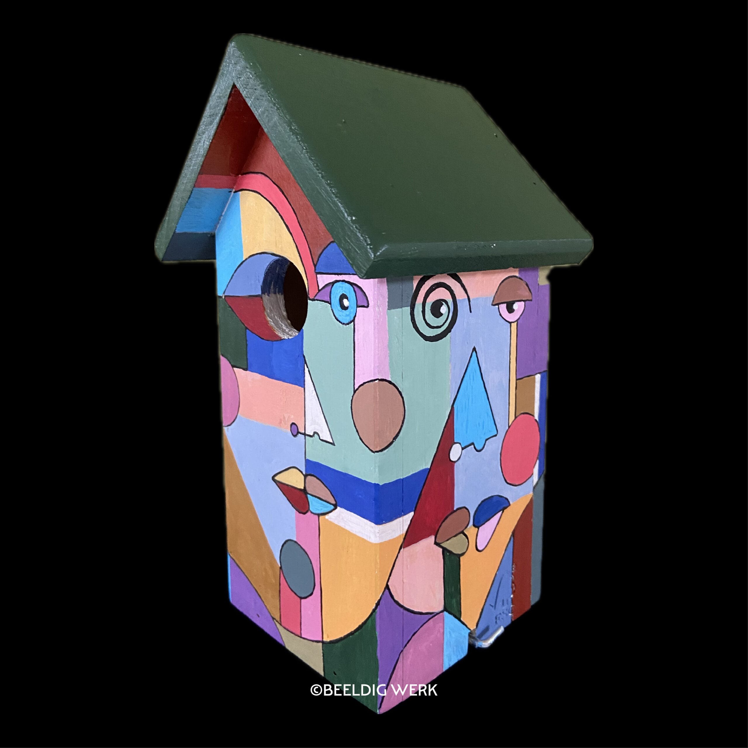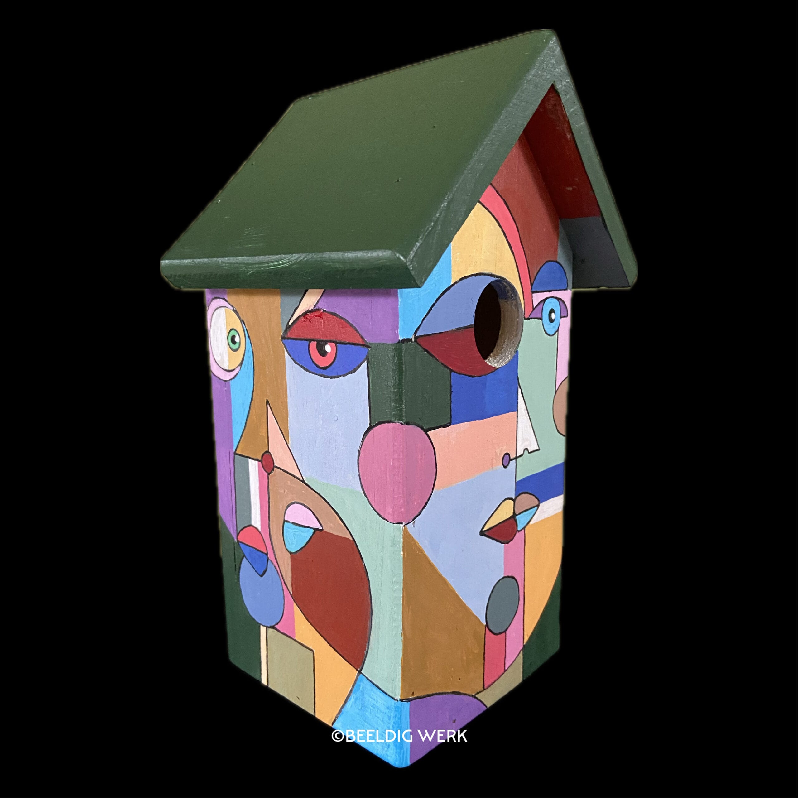 Beschilderde nestkast “multicolor faces” met kleurrijke gezichten, kubistisch en abstract. Afgelakt met vernis. Makkelijk te reinigen via de zijkant.