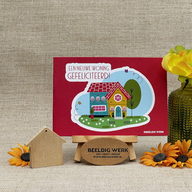 Iemand verhuisd?  Feliciteer ze met deze vrolijke verhuiskaart van Beeldig Werk. Een kleurrijk geel-blauw huis op een rode achtergrond. Stuur nu deze attente, unieke groet! Bestel direct online.