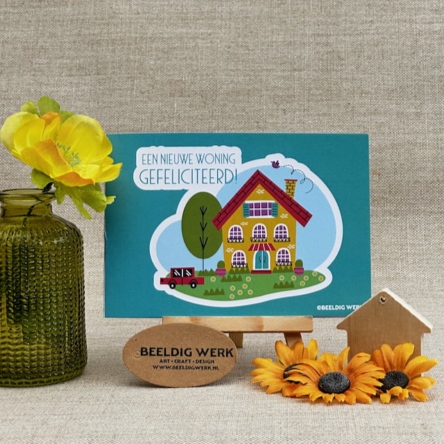 Iemand verhuisd? Feliciteer ze met deze vrolijke kaart van Beeldig Werk. Een unieke illustratie van een geel huis en tuin op blauwgroen. Stuur nu een attente groet! Bestel ‘m direct online.
