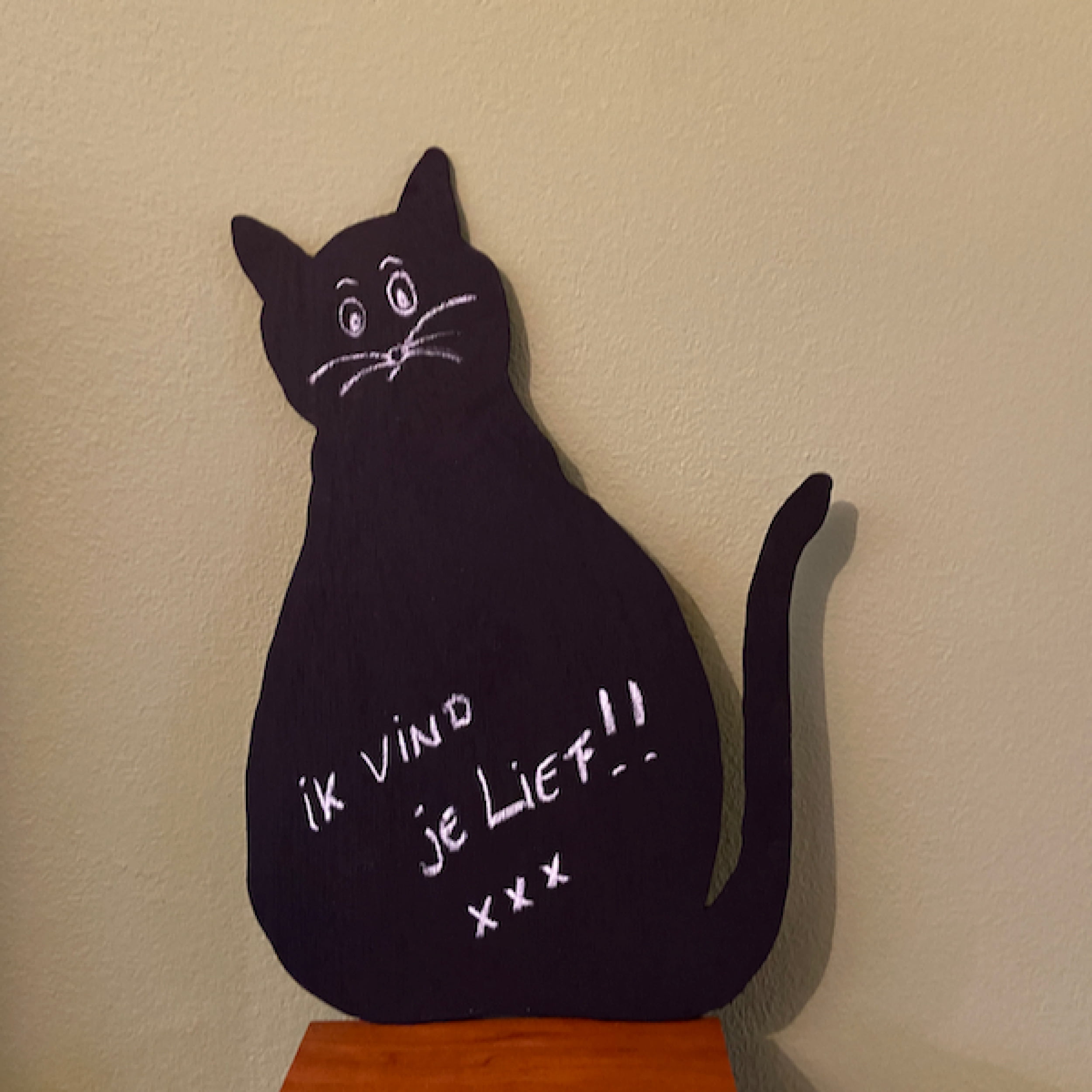 Vrolijk en uniek schoolbord in de vorm van een poes van Beeldig Werk. Aan beide kanten te gebruiken! Krijt is makkelijk te wissen. Leuk voor jong én oud. Bestel dit speelse item nu online!