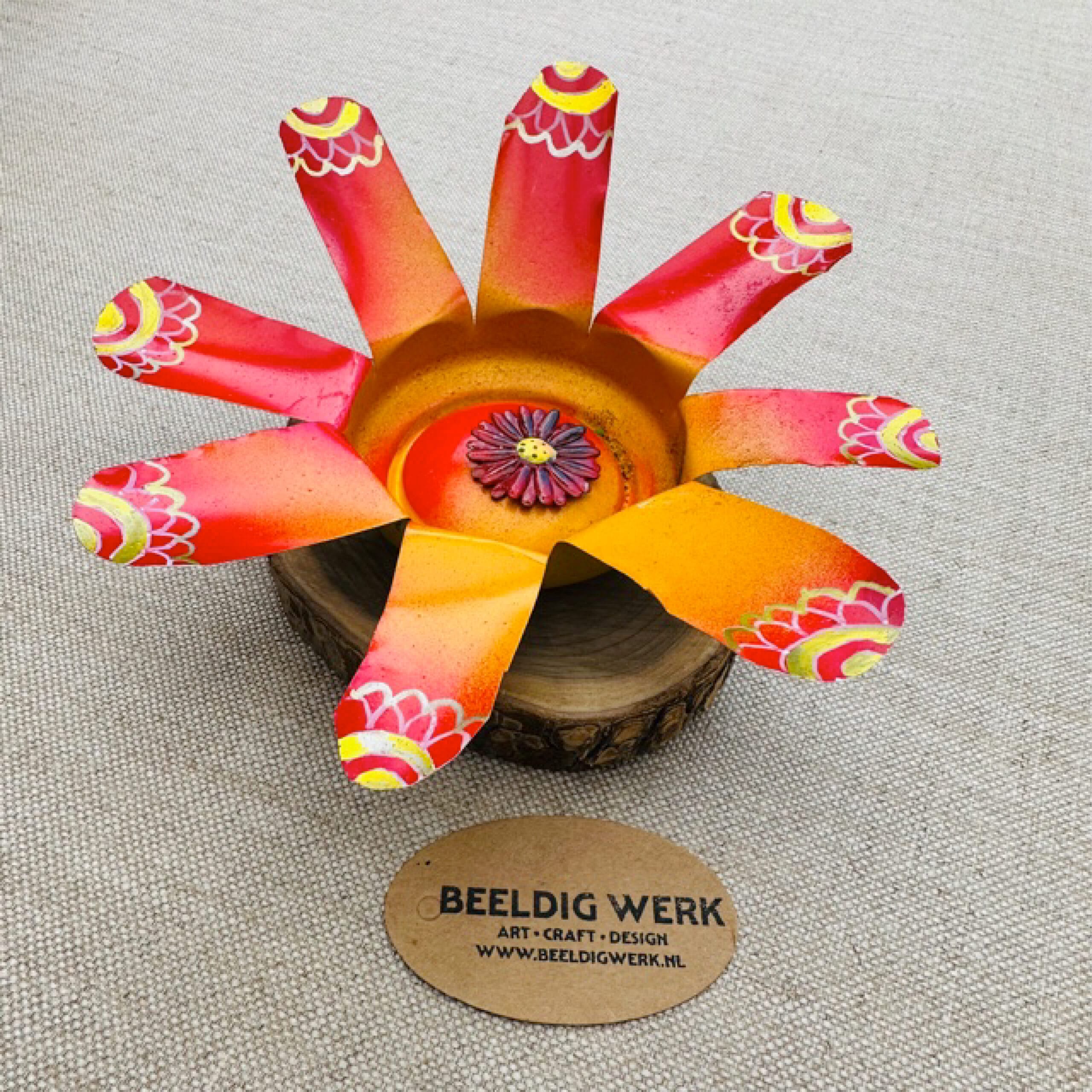 Handbeschilderde bloemvormige waxinelichthouder. Gemaakt van een gerecycled aluminium drankblikje en bevestigd op een houten boomschijf. Exclusief waxinelichtje.